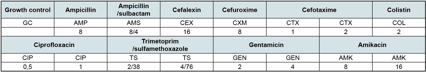 The kit is designed to test antimicrobial susceptibility of bacteria isolated from urine tract, especially family Enterobacteriaceae. It enables prognosis of ESBL production. The kit contains 40 detection strips. Click table for larger image.