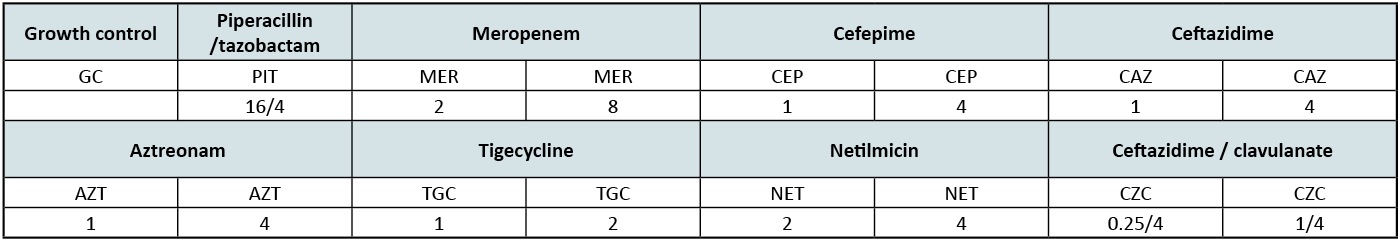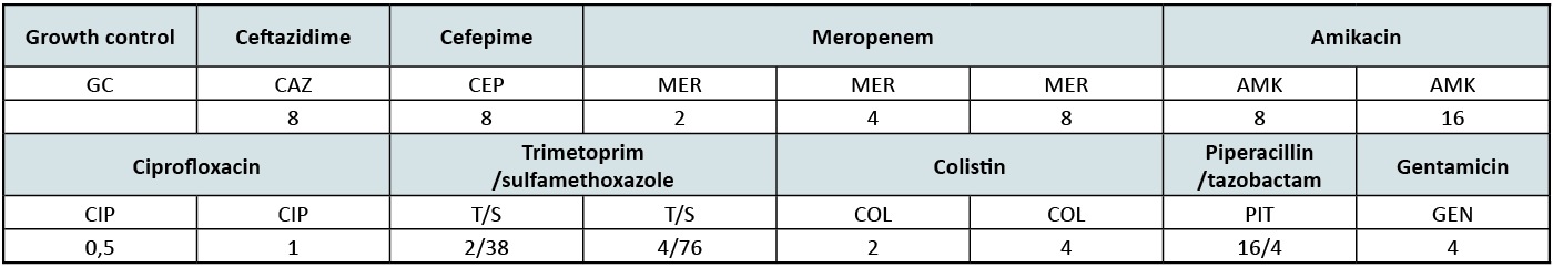 The kit is designed to test antimicrobial susceptibility of non-fermenting bacteria. It enables prognosis of MBL (metallo-beta-lactamase) production. The kit contains 60 detection strips. Click table for larger image.