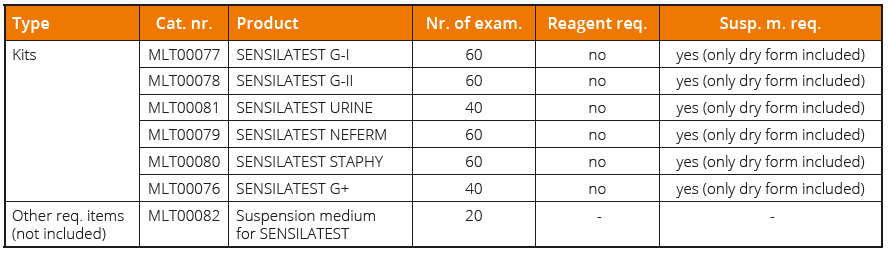 The kit is designed to test antimicrobial susceptibility of bacteria from Enterobacteriaceae family. The kit contains 60 detection strips. It enables prognosis of ESBL production. We recommend to use SENSILAtest G-I together with SENSILATEST G-II to test susceptibility of antibiotics aimed for treatment of serious infections especially in hospitalized patients. Click table for larger image.